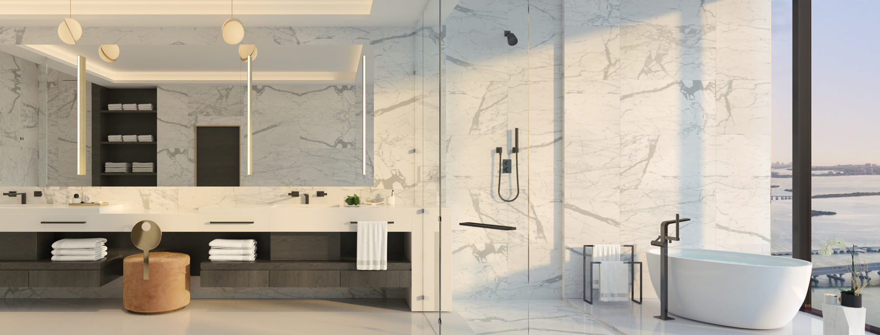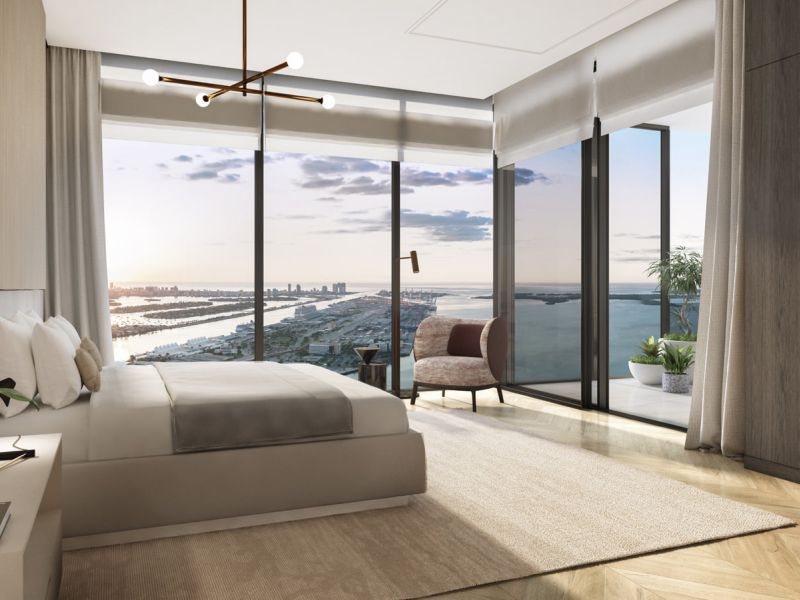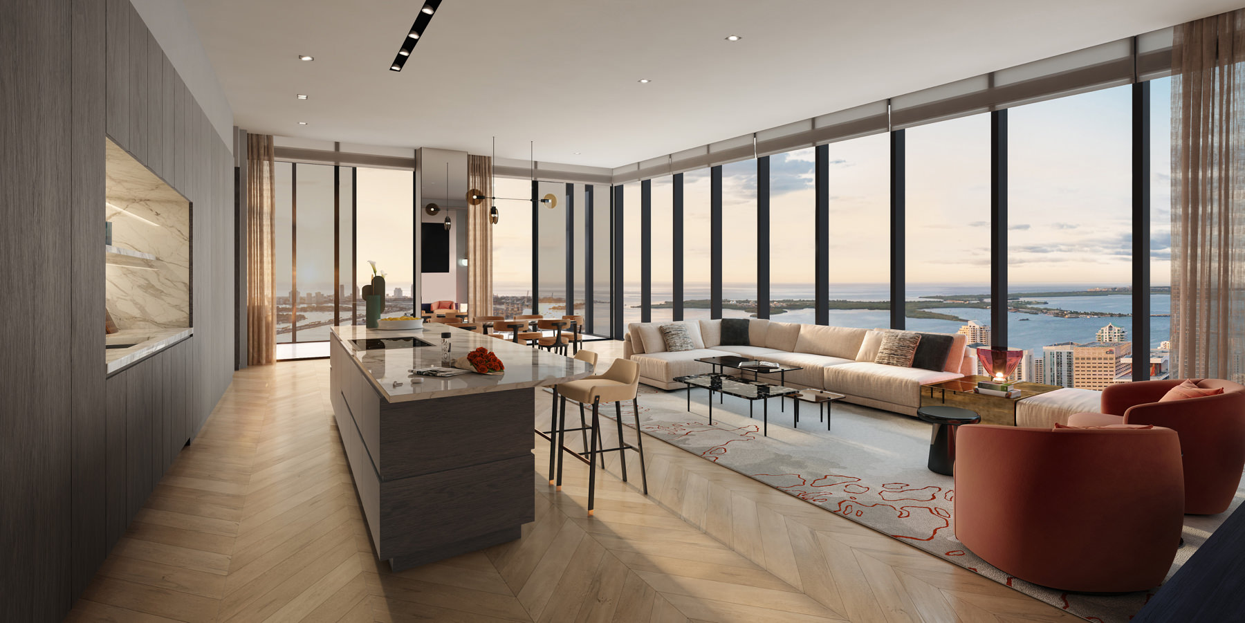 10-foot floor-to-ceiling windows with stunning views of city and downtown skyline, Miami Beach and Atlantic Ocean